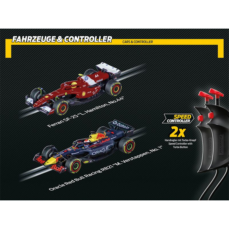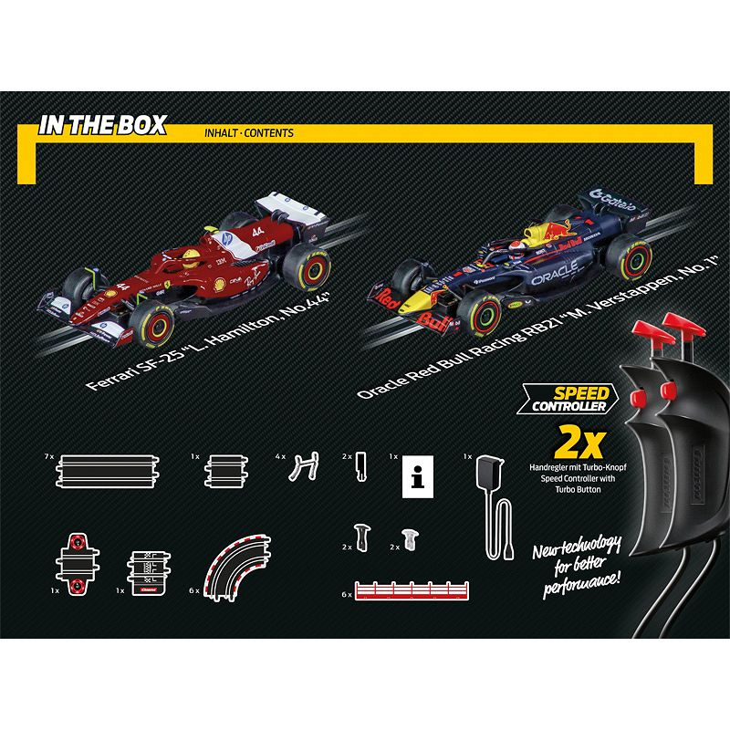 Набор Carrera GO!!! «Гонки чемпионов» — это не просто скорость: здесь встречаются две легенды Формулы-1. На 4,3-метровой трассе Oracle Red Bull Racing RB21 «М. Ферстаппен, №1» и Ferrari SF-25 «Л. Хэмилтон, №44» участвуют в захватывающих дуэлях, бросая вызов не только болельщикам, но и самим гонщикам.