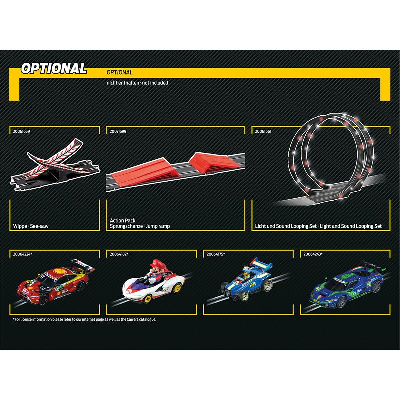 Carrera GO!!! - стартовая система для Carrera Racing World, созданная в масштабе 1:43. Все наборы этой серии включают в себя контроллер турбонаддува, а также оригинальные, лицензированные автомобили, изготовленные с большим вниманием к деталям. Каждый набор всегда идет с дополнительным набором контактных щеток. Рельсовые системы чрезвычайно просты в сборке и разборке благодаря уникальной системе защелок.