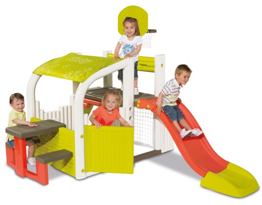 Спортивно-игровой комплекс Smoby предназначен для детей от 2 лет. Данный комплекс является полноценной спортивной игровой площадкой для малышей, в которой есть все необходимое для активного отдыха, а именно: горка, сетка для игры в футбол, баскетбольное кольцо, игровой столик и беседка. По всему периметру расположены игровые зоны. У детей будет множество занятий на выбор, они могут посидеть за столиком и порисовать, спокойно отдохнуть в беседке под солнцезащитным навесом, покушать, попить и продолжать игру. Поиграть в футбол, в баскетбол, в прятки, скатиться с горки и начать все с начала. Изготовлен из высокопрочного европейского пластика, который выдерживает морозы до -25 градусов, не выгорает на солнце, не деформируется при перепаде температур. Острые углы и грани отсутствуют. В конструкции предусмотрены отверстия для лазанья, оригинальная лестница с необыкновенными ступеньками и горкой. Простой монтаж, который не требует использования инструментов, все детали выполнены из качественной пластмассы. Рекомендована установка на ровной устойчивой поверхности.
